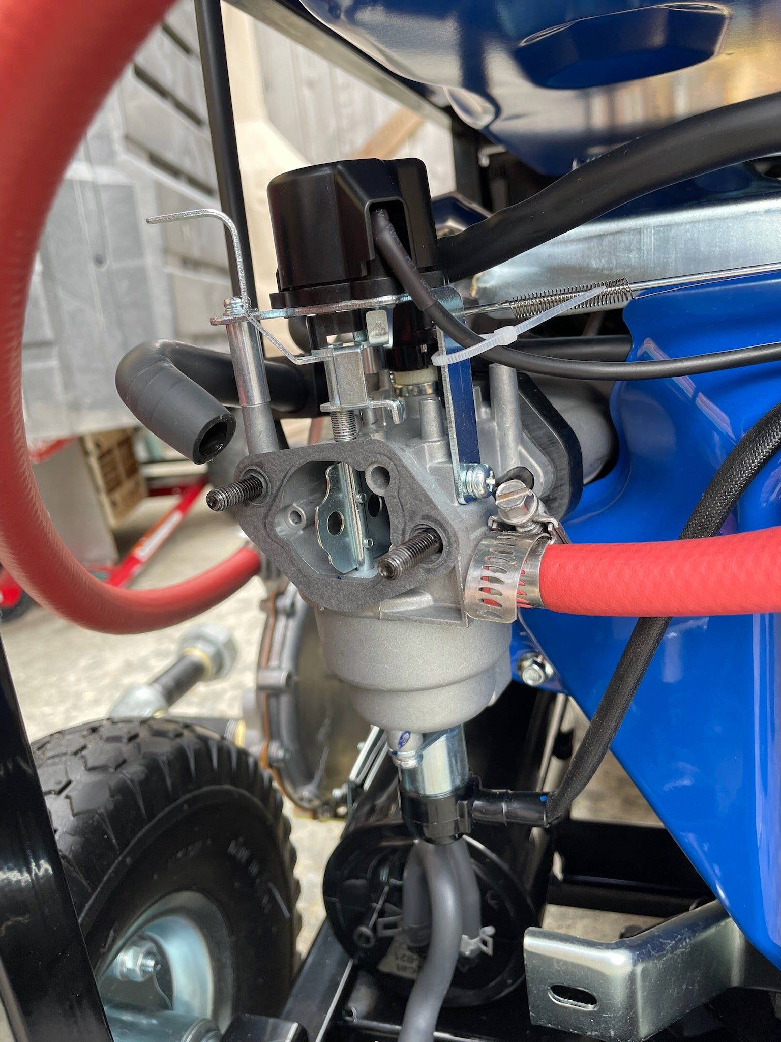 Mount the demand regulator and run the 3/8" line from the new demand regulator into the propane port on the stock carburetor.